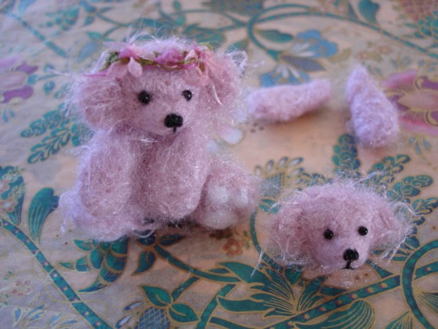 I've begun a little pink girlie..... she is not wool. But... the tufts I pluck with eyebrow tweezers from a chunk of rayon. I like the colour and I like that I can needle in some more loose bits at the end and she looks all fluffy. This is perfect for poodle fur... I've done several stitched poodles from it.. but, it's tricky to felt because the sharp larger needles won't even go into it after two stabs ... they get stuck and if I push hard .. risk breaking them... or stabbing myself a good one because she is sooo tiny. I just use an ancient, almost dull, fine needle instead. It finally gathers ....